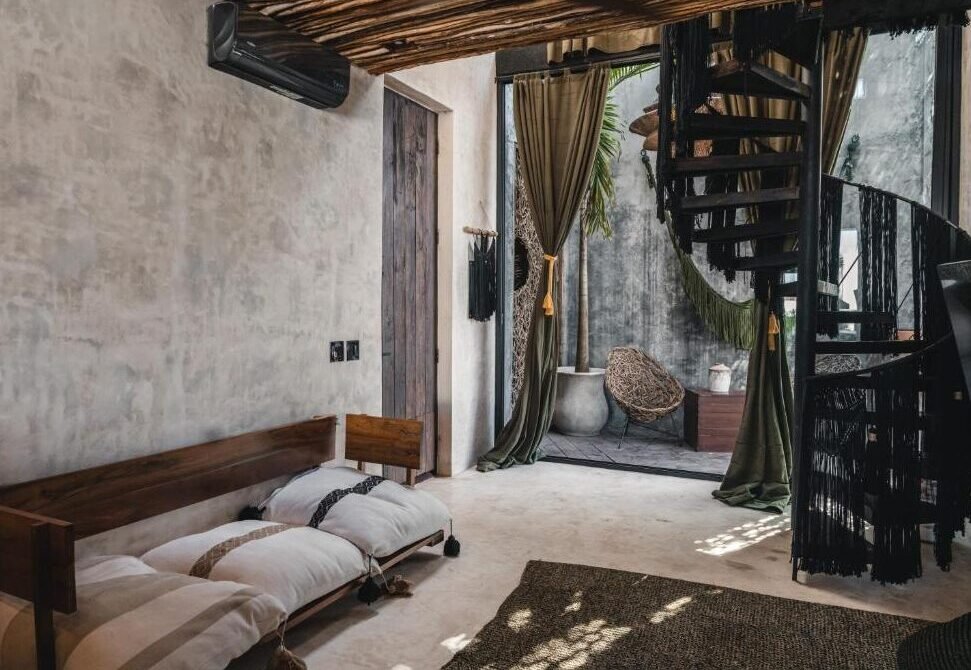 Elegantiškas viešbutis Tulumo mieste su originalaus dizaino kambariais, pritaikytais ilgesnei viešnagei. Juose rasite virtuvę su visa būtiniausia įranga, skalbimo mašiną ir kitus patogumus. Aukštesnės klasės numeriai puikuojasi privačiais baseinais su nuotraukos vertomis supynėmis.